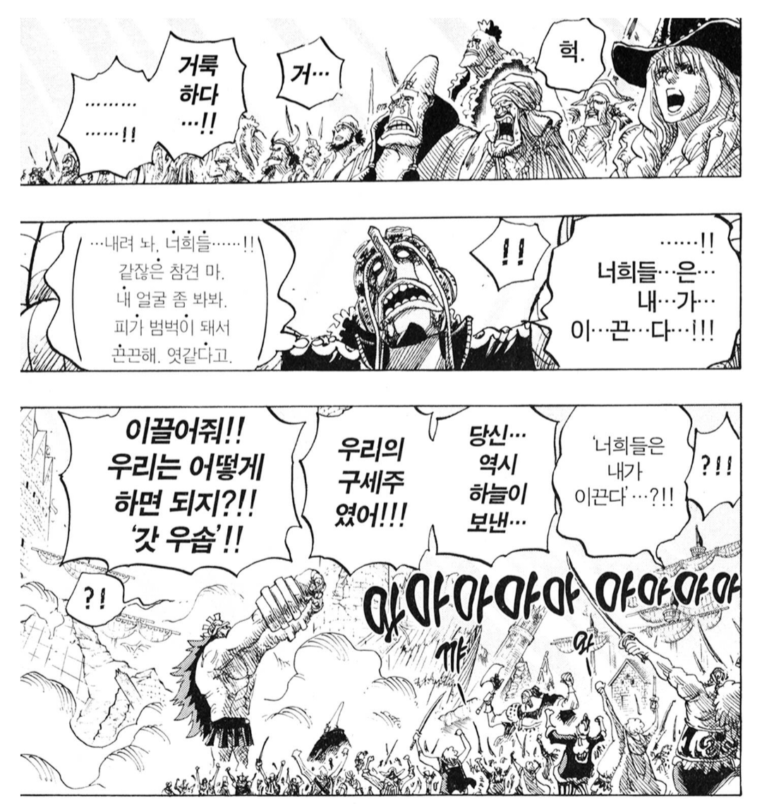 드디어 징베가 가? 입? 다운 가? 입? 을 해서 좀 웃겼음 (어인섬부터 토트랜드까지라니 너무 길었다 심지어 제대로 된 가입도 아냐 태양해적단 도망치게 한 다음 다시 돌아온데 징베야)
