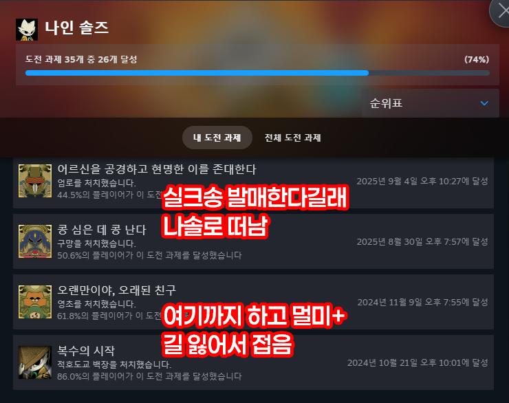 개인적으로 바벨탑…(번역이 좀 달랐던 것 같은데 유저 한패를 돌리고 해서 정식 번역이 어떤지를 모르겠네)에서 진짜 2차 게임 접음 이슈를 맞이할 뻔 했는데 이것도? 어찌저찌 되더라고요 진짜 엄청 극악난이도는 아니었던 것 같음